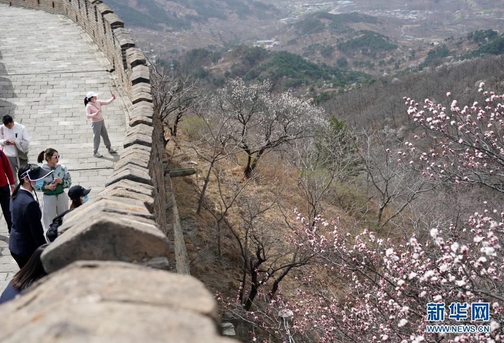 3月31日,游客在北京慕田峪長(zhǎng)城游玩賞春。