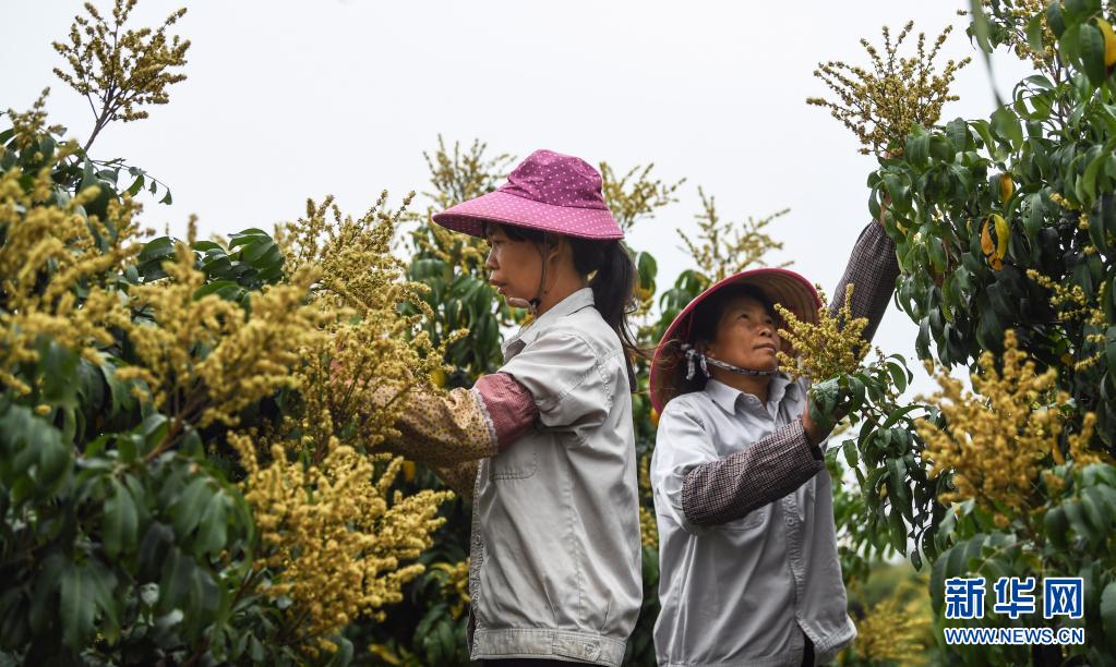 4月5日,廣西欽州市久隆鎮(zhèn)青草村村民在進(jìn)行果樹管理。