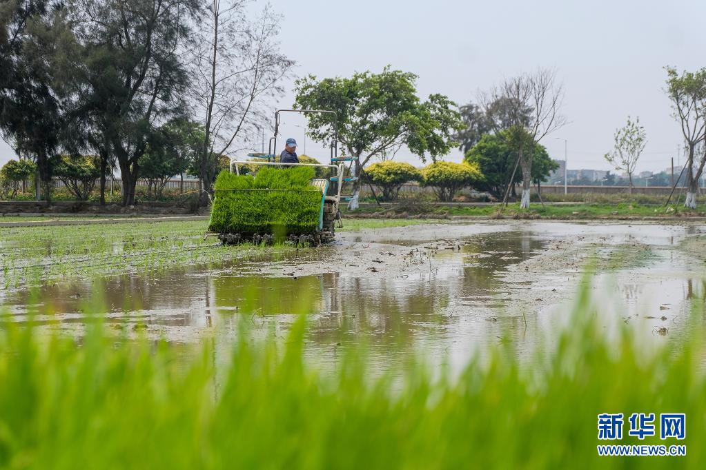 4月5日,在福建省石獅市科技種子試驗場,農民駕駛插秧機在田里插秧。