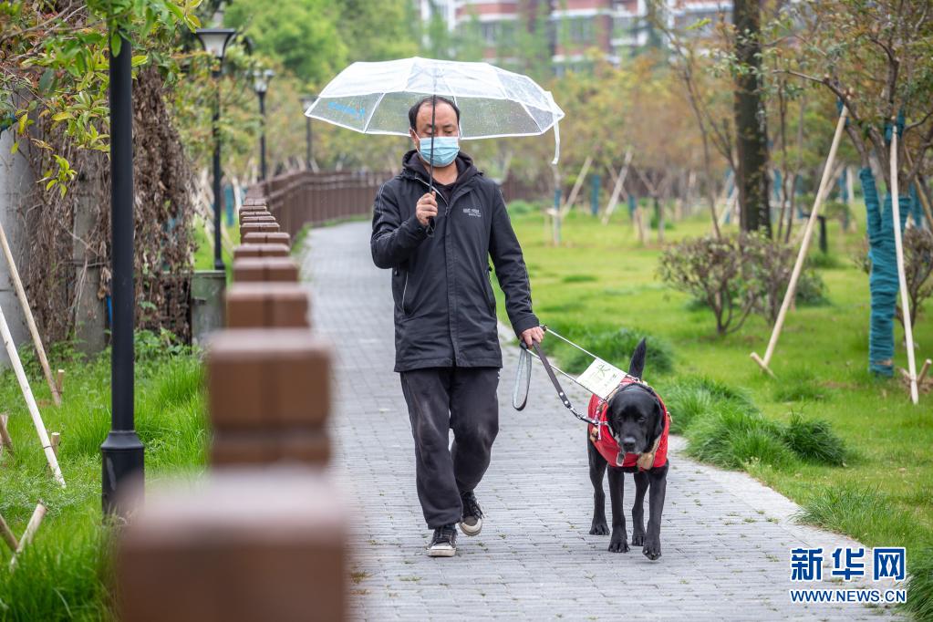 吳虎剛今年45歲,和同是盲人的妻子經(jīng)營著一家盲人推拿診所。每天上班,導(dǎo)盲犬“C羅”都會陪伴吳虎剛從家走到診所(4月11日攝)。 新華社發(fā) (張夢 攝)