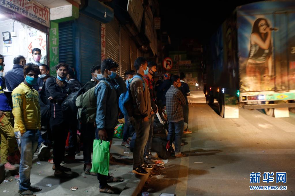 4月28日晚,人們在尼泊爾首都加德滿都的路邊等車,準備在封禁措施實施前離開加德滿都返回家鄉(xiāng)。