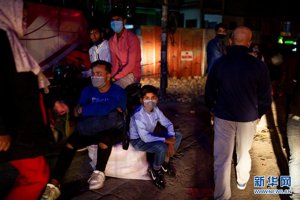 4月28日晚,人們?cè)谀岵礌柺锥技拥聺M都的路邊等車,準(zhǔn)備在封禁措施實(shí)施前離開加德滿都返回家鄉(xiāng)。
