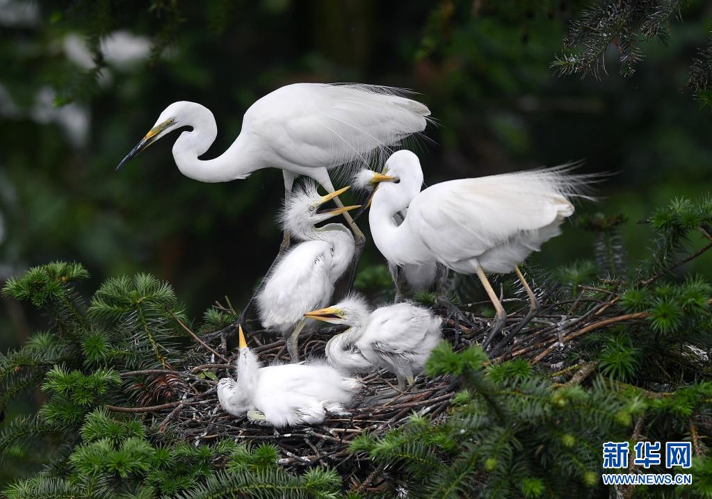 在南昌市新建區(qū)象山森林公園內,白鷺在給雛鳥喂食(5月18日攝)。
