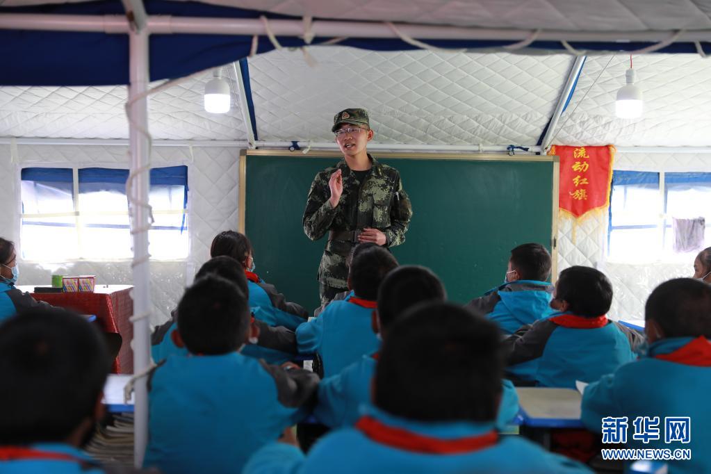 當(dāng)日是青海果洛瑪多縣花石峽鎮(zhèn)藏文中心寄宿制小學(xué)震后復(fù)學(xué)第一天,學(xué)校邀請(qǐng)他以“國(guó)家、奮斗、團(tuán)結(jié)”為主題,和孩子們進(jìn)行交流。