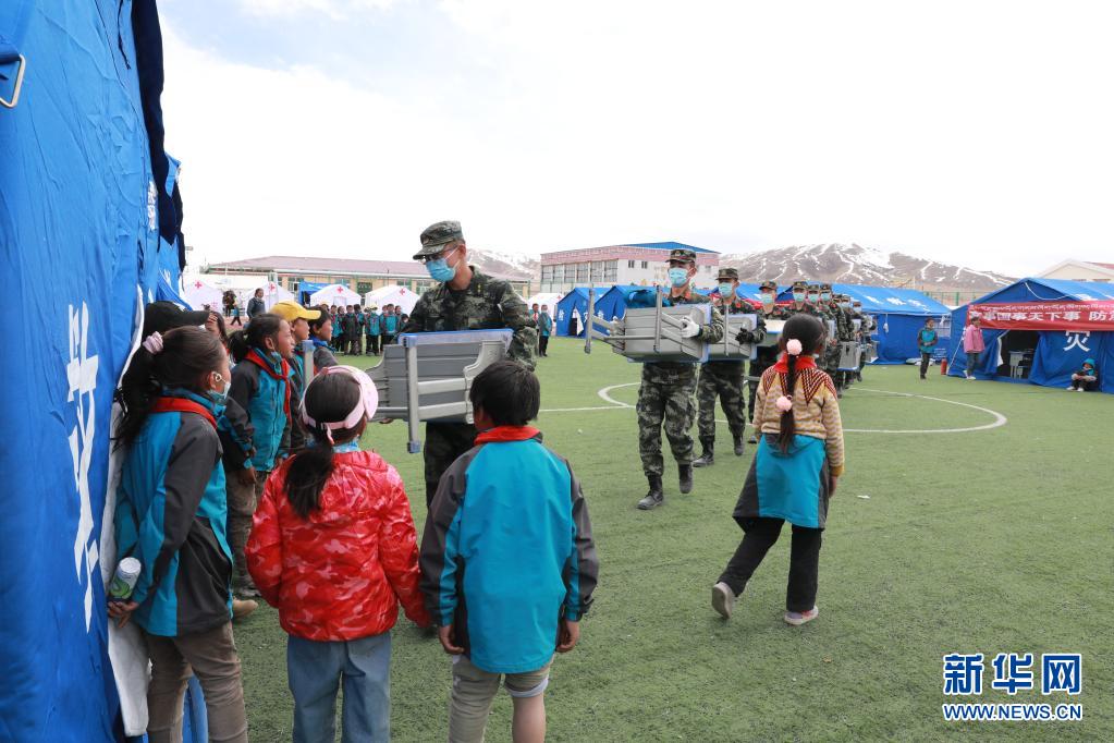 5月24日,武警青海總隊(duì)果洛支隊(duì)機(jī)動(dòng)大隊(duì)排長(zhǎng)張國睿(前一)和戰(zhàn)友為花石峽鎮(zhèn)藏文中心寄宿制小學(xué)的帳篷教室搬運(yùn)課桌。新華社記者 劉芳 攝