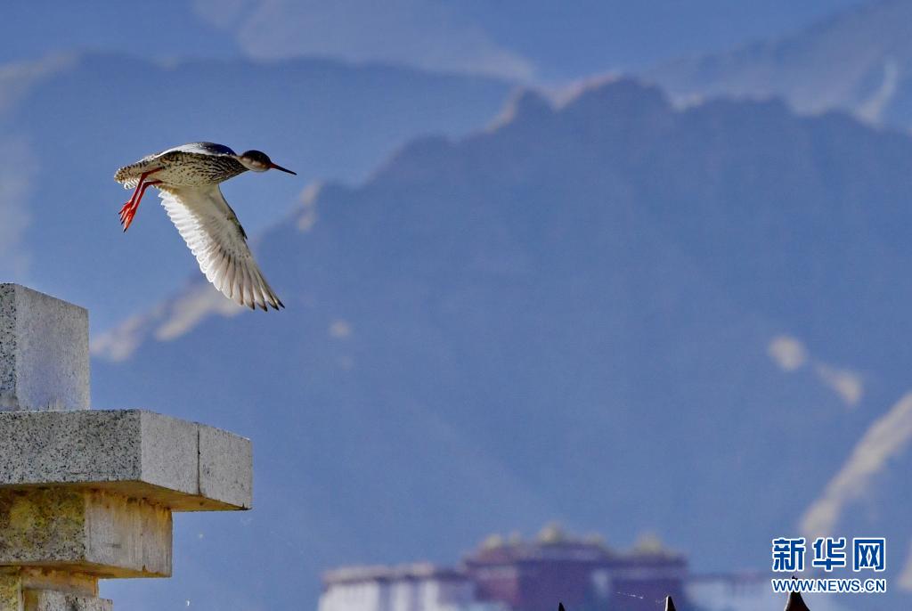 初夏,紅腳鷸在位于西藏拉薩的拉魯濕地國(guó)家級(jí)自然保護(hù)區(qū)內(nèi)起舞覓食。