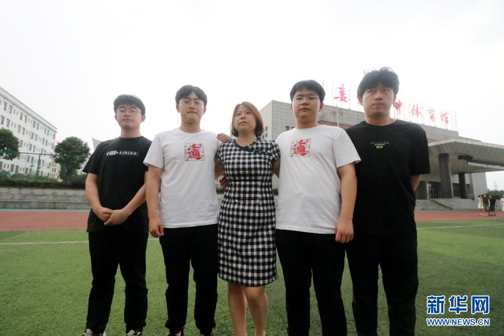 6月9日,在湖南省婁底市第四中學(xué),四胞胎兄弟李慶國(guó)(左一)、李慶泰(左二)、李慶民(右二)、李慶強(qiáng)(右一)在高考結(jié)束后和媽媽合影。