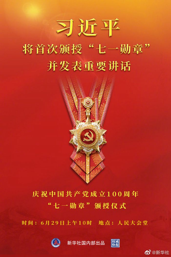 慶祝中國共產(chǎn)黨成立100周年“七一勛章”頒授儀式將于29日上午10時(shí)在人民大會(huì)堂隆重舉行。習(xí)近平為“七一勛章”獲得者頒授勛章并發(fā)表重要講話。