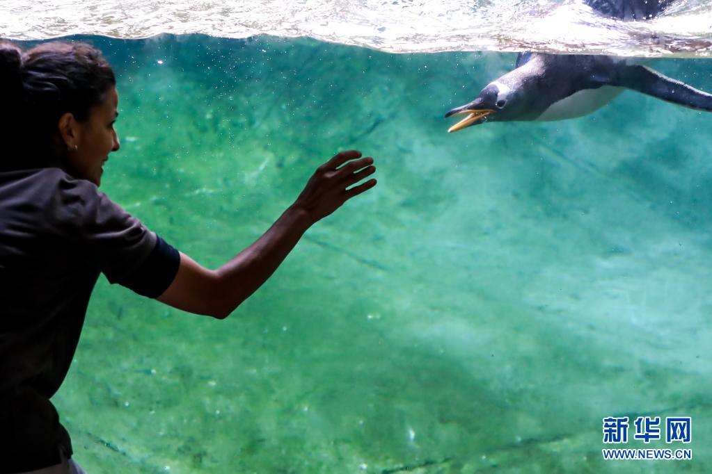 7月5日,飼養(yǎng)員在比利時布呂熱萊特的天堂動物園與巴布亞企鵝互動。