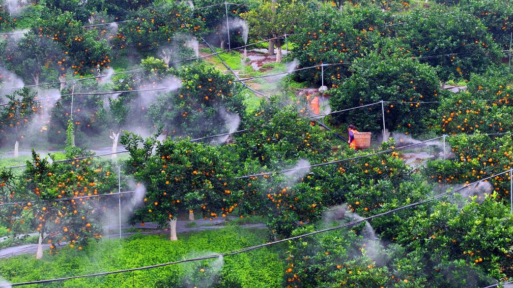 在重庆江津区夏坝镇太阳橙基地,管护人员利用微弥雾系统浇灌橙园。新华社发