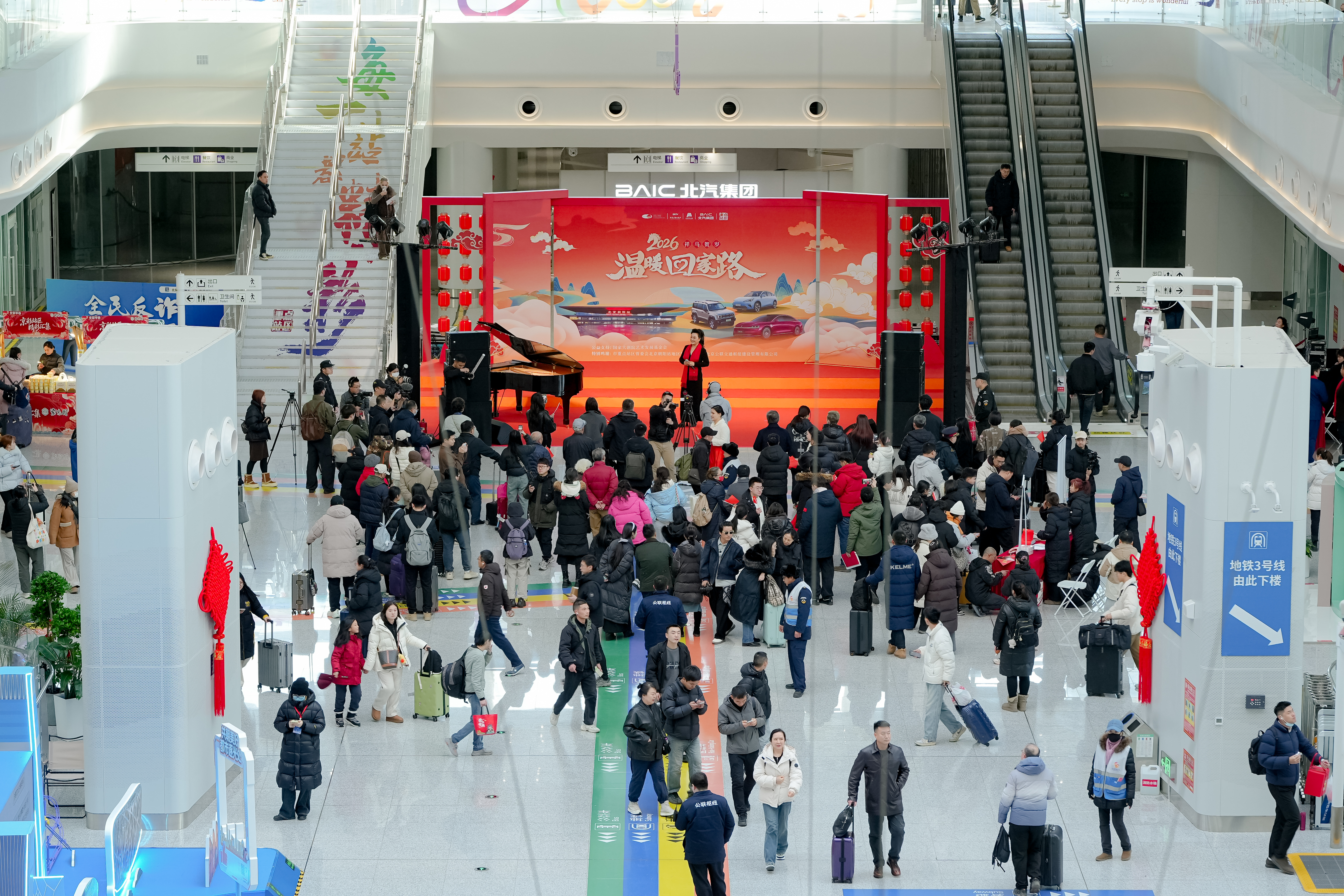 北京朝阳站宽敞明亮的枢纽大厅里,北汽青年合唱团上演惊喜快闪,国家大剧院的艺术家们带来顶尖艺术殿堂的表演,原本步履匆匆的旅客纷纷驻足,目光被这突如其来的美好点亮。2月11日至14日,北汽集团联手国家大剧院艺术发展基金会、北京广播电视台、北京演艺集团,在朝阳站持续进行“温暖回家路”公益演出,带来快闪、独唱、合唱、魔术、乐队合奏等节目,为广大旅客献上一场“沉浸式”的文化体验,营造热闹团圆、喜庆祥和的节日氛围,让广大旅客开开心心踏上回家的列车。旅客们现场打卡,拍摄带有北汽元素的暖心时刻,发布在社交平台,即可抽取精美礼品。