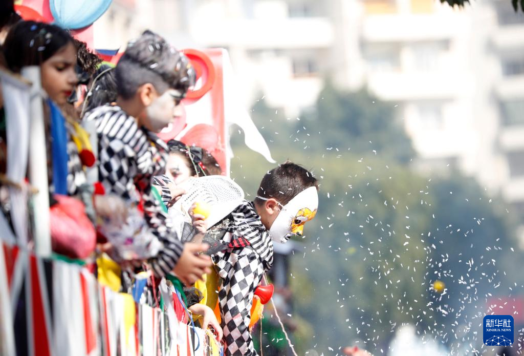 2月26日,盛装的孩子们在塞浦路斯利马索尔参加狂欢节。