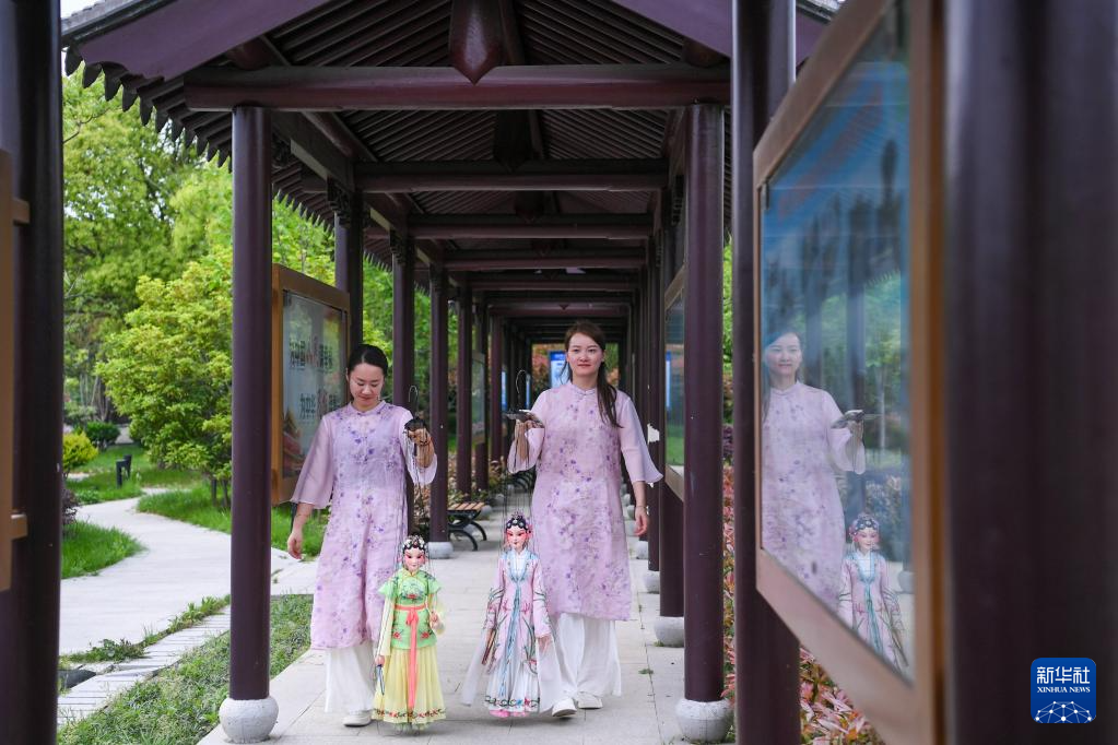 孙菁(右)和施锦芳在苏州市吴江区七都镇一处公园内进行排练(4月18日摄)。他们手提十多根线操纵着约六十厘米高、七八斤重的木偶,通过手指、形体动作来操控木偶的动作神态。