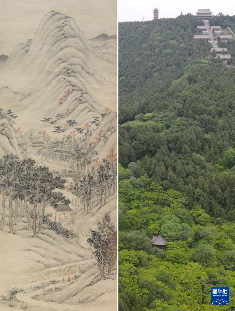 这是一张拼版照片,左图为:《八公秋霁图》,由清代画家潘思牧创作,现收藏于安徽博物院(新华社发,李鹏飞 摄);右图为:5月16日拍摄的位于安徽省淮南市寿县的八公山风景区(无人机照片,新华社记者张端摄)。