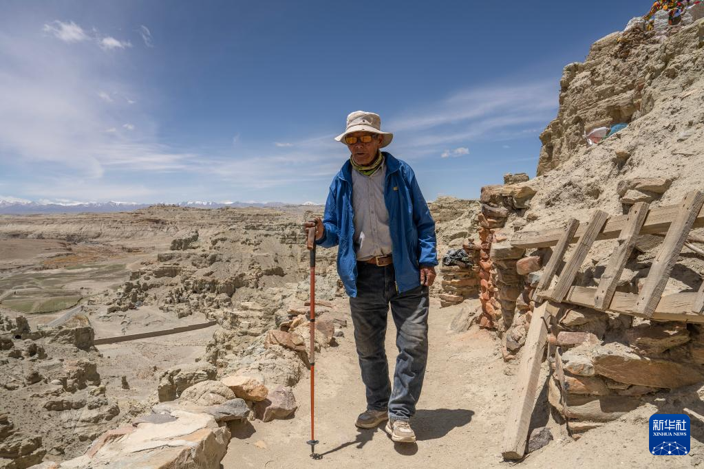 仁增旺扎老人巡查各个石窟,这是他多年来的习惯(5月26日摄)。