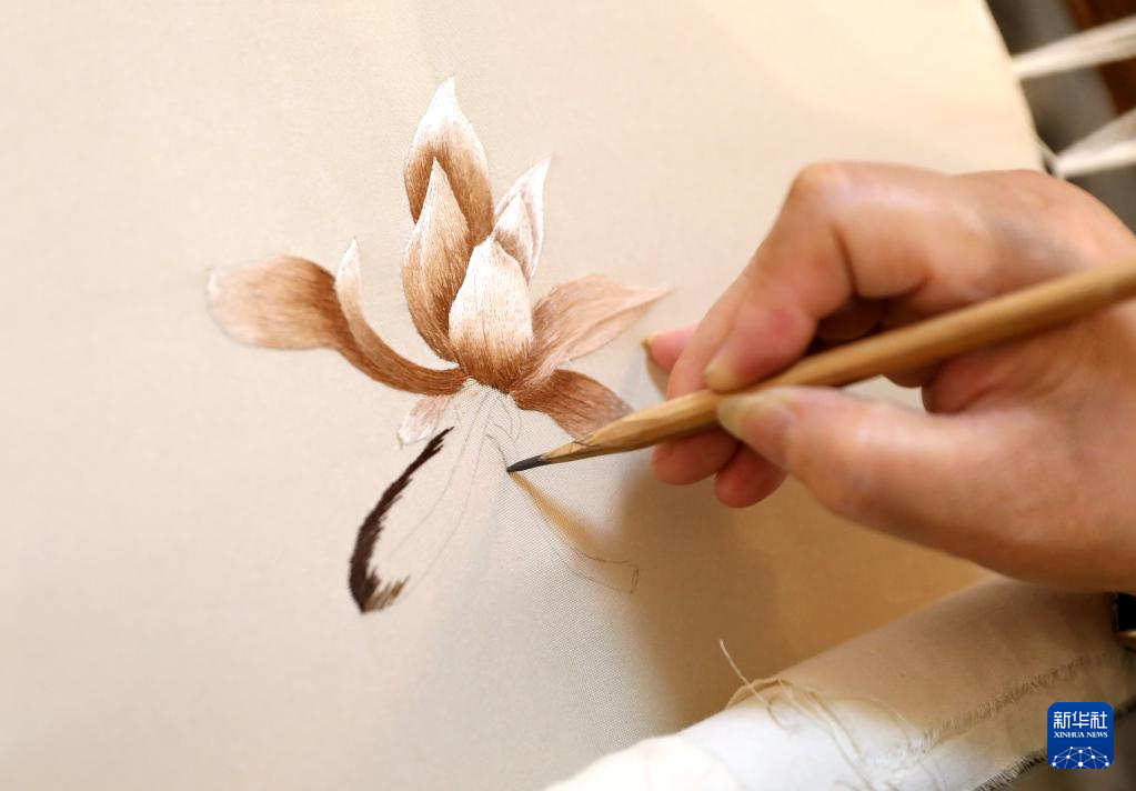 7月5日,王立君在位于辽宁省营口市辽河老街上的工作室里进行满绣创作。