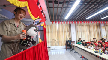 7月21日晚,小朋友在夜间“那达慕”大会上体验拔河。