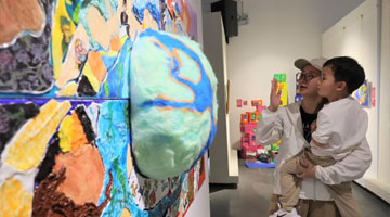 7月21日,孩子们在中国滦州皮影博物馆内参观。