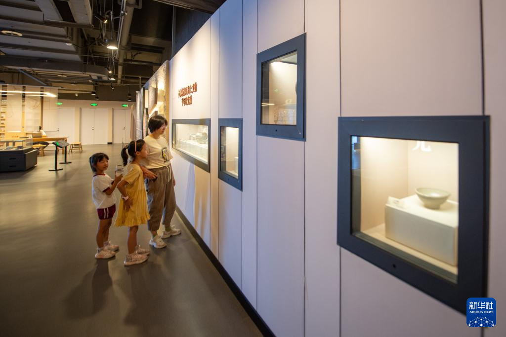 8月9日,在杭州西站候车的旅客带着孩子参观“西站两千年——李家塘遗址文物展”。