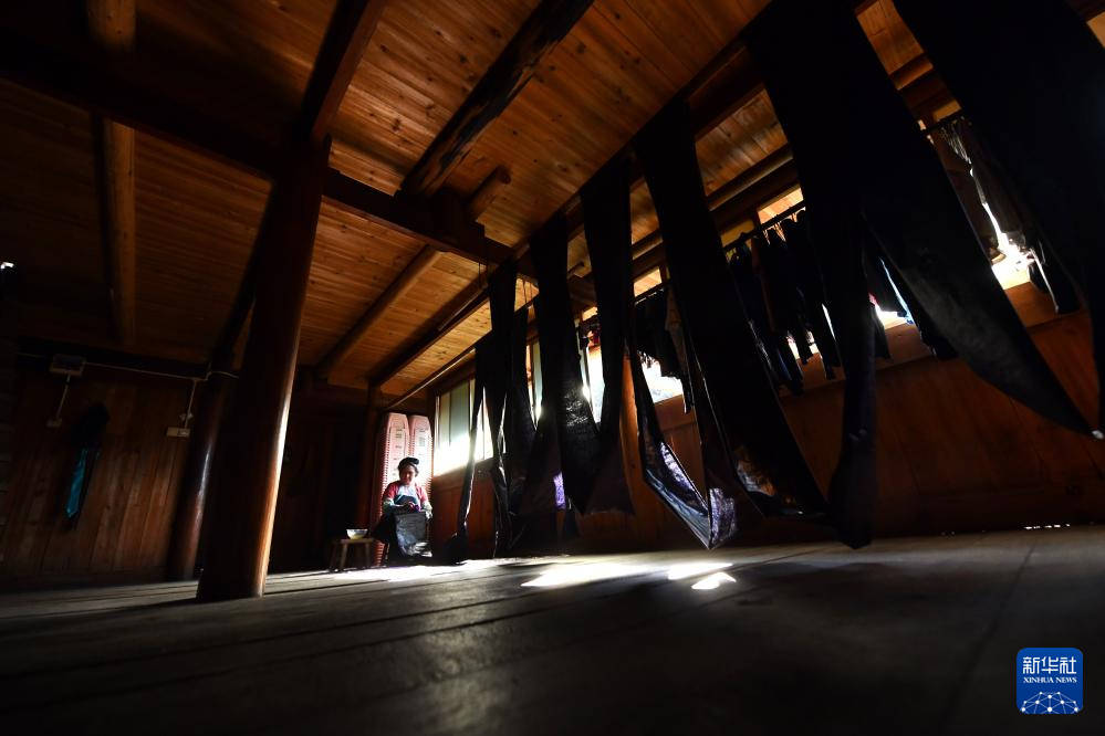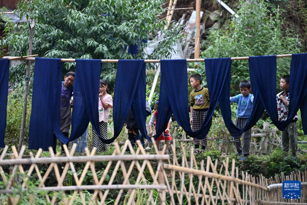 乌英苗寨妇女在亮布文化小广场上晾晒亮布(2023年9月2日摄)。