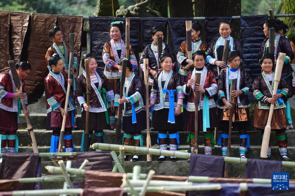 在乌英苗寨,苗族妇女们制作亮布的传统工艺非常复杂。每年春季,她们都会种植蓝靛草,到秋季收割后,用山泉水将蓝靛草浸泡数日,然后加入石灰等,调配成染料。布料经过染料浸染、晾晒、捶打、涂蛋清、蒸布,并如此多次反复,一匹亮布做成往往耗时数月之久。其中,最重要的工序就是捶打亮布,每一匹布,苗族妇女都要抡起约十斤重的木槌,捶打数万下,让布料逐渐闪闪发亮,制成的“亮布”可以长久保持光泽。