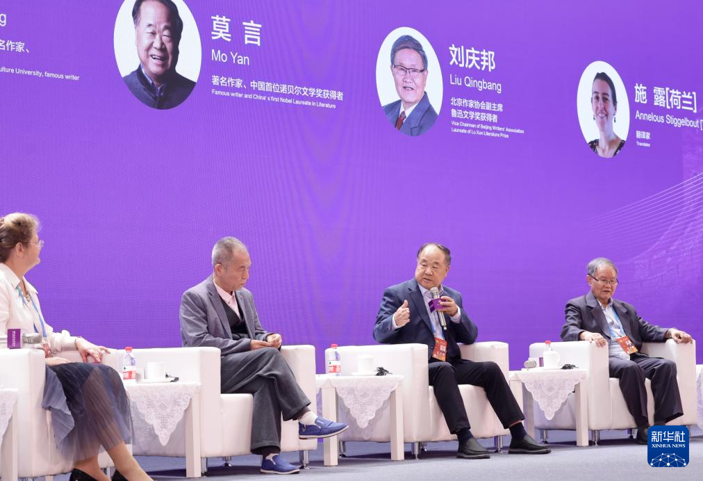 9月15日,作家莫言(右二)在“以文化人:文艺价值与社会生活”平行论坛的“中国文学与世界对话”圆桌对话现场发言。