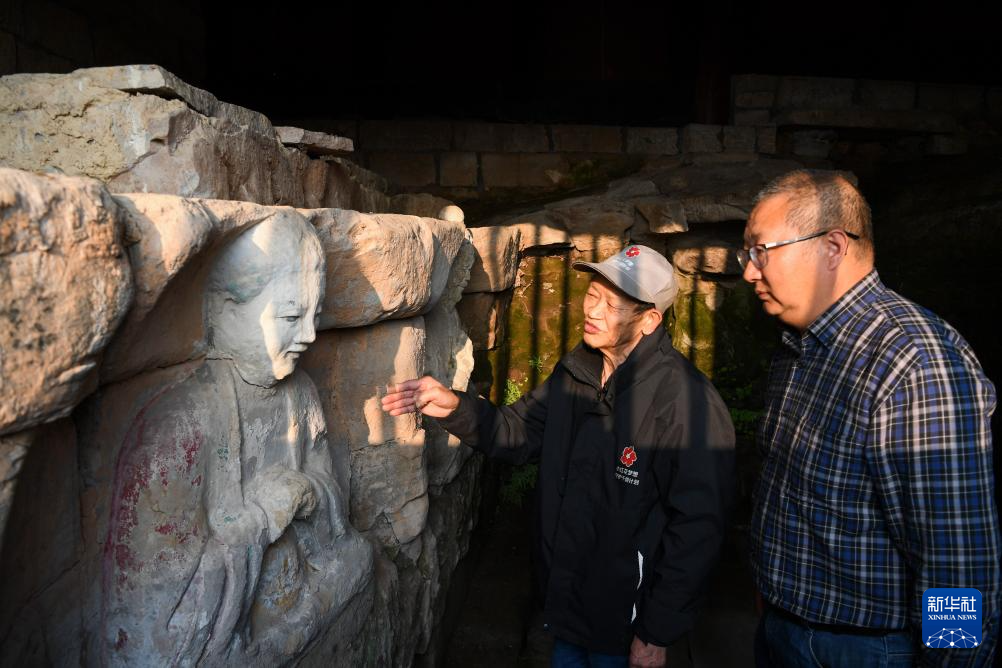 10月31日,在重庆市大足区中敖镇金盆村,义务文保员(左)在向大足石刻研究院工作人员介绍普圣庙摩崖造像保护情况。