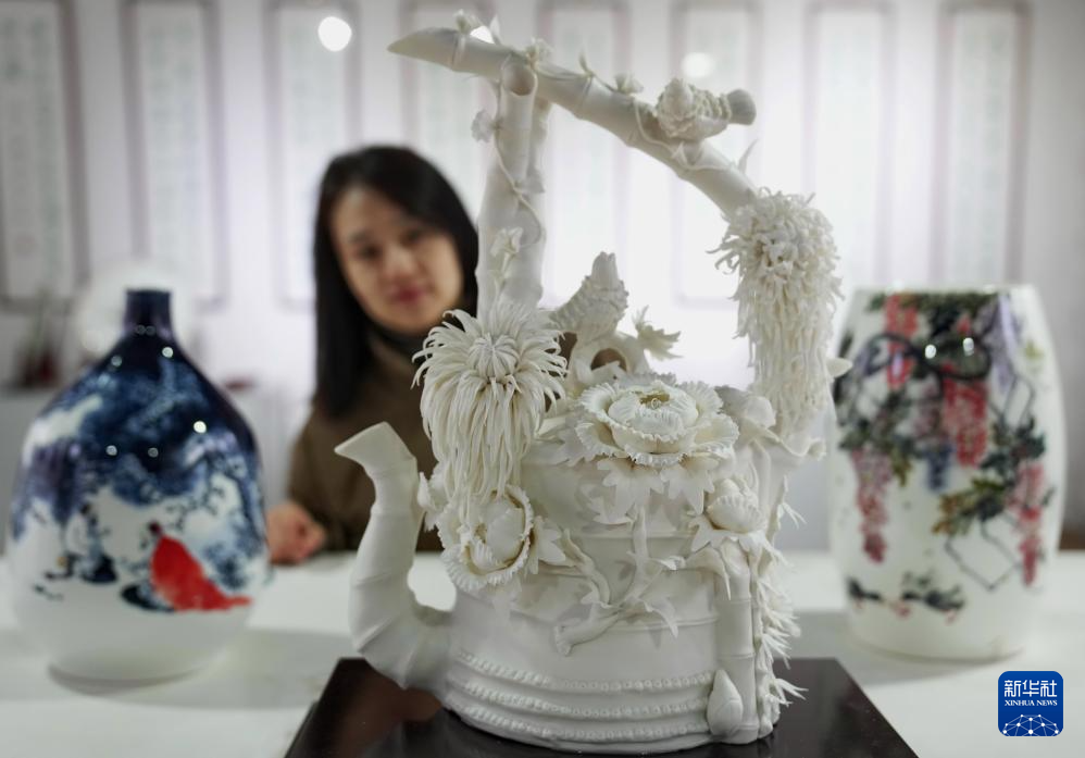 11月21日,一位工艺美术师在唐山市开平区陶瓷文创产业园创作陶瓷绘画作品。