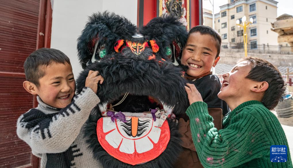 在西藏昌都市洛隆县硕督镇硕督村,孩子们手捧狮子舞道具玩耍(1月19日摄)。