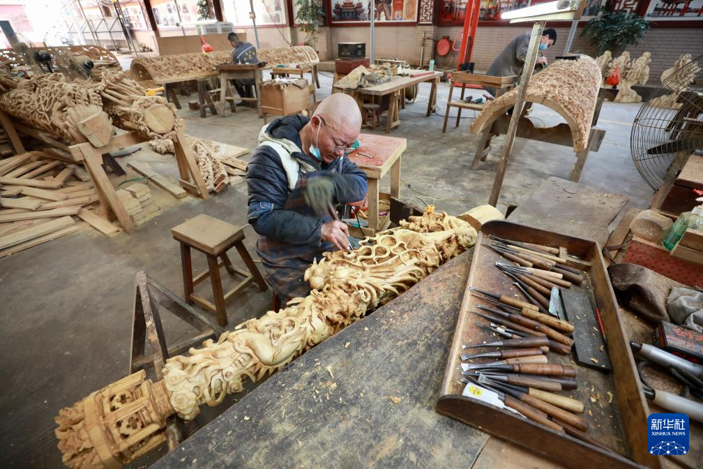 龙年春节将至,在福建省晋江市东石镇潘山村的木雕厂内,工人们加紧赶制出货订单,一件件精美的龙柱、龙头等庙宇木雕产品在工人们的精雕细琢中诞生。潘山庙宇木雕以庙宇雕刻为表现方式,历史悠久,工艺精湛,产品主要在海峡两岸销售,同时销往新加坡、印度尼西亚、菲律宾等东南亚国家。2021年,以潘山庙宇木雕为代表的泉州木雕成功入选第五批国家级非遗名录。