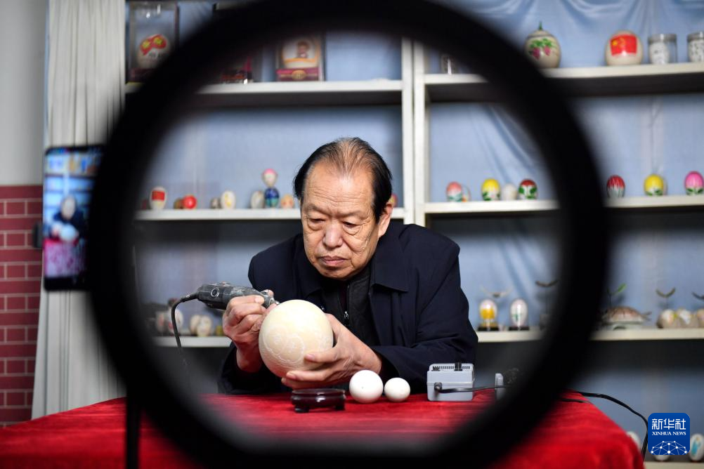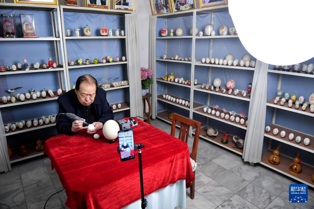 2月19日,非遗项目蛋雕技术传承人郑青山通过网络直播表演蛋雕制作技巧。