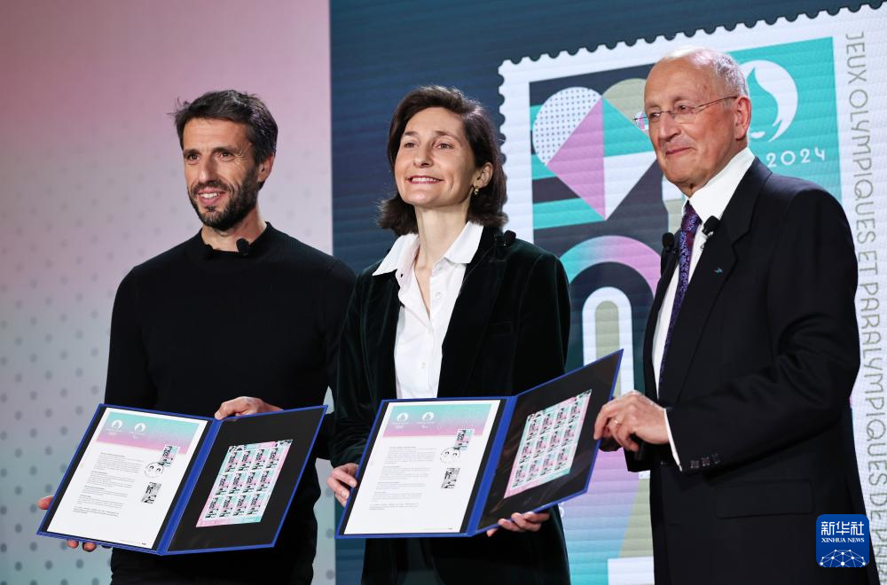3月26日,法国邮政集团总裁菲利普·瓦尔、法国体育部长卡斯特拉、巴黎奥组委主席托尼·埃斯坦盖(从左至右)揭晓巴黎奥运会及残奥会官方邮票。