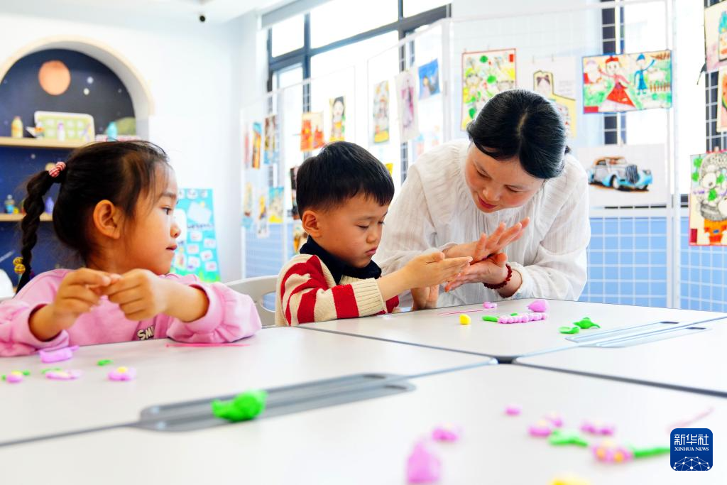 4月14日,在菏泽市巨野县凤凰社区党群服务中心,志愿者在公益“周末课堂”上教孩子捏橡皮泥。