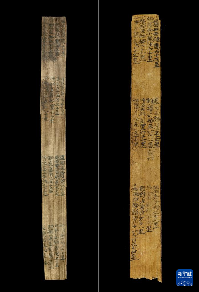 这是出土于今内蒙古自治区额济纳旗破城子遗址的《居延里程简》(左)和出土于甘肃省敦煌市悬泉置遗址的《悬泉里程简》(拼版照片,资料照片)。新华社发(甘肃简牍博物馆供图)