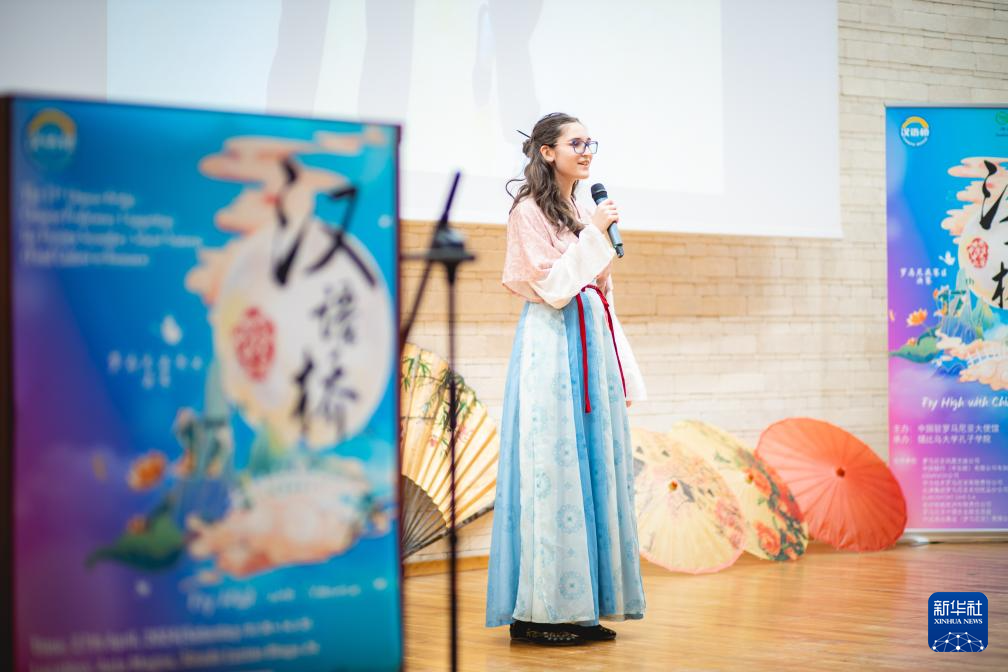 4月27日,在罗马尼亚锡比乌,特等奖获得者林娜(中文名)在第17届“汉语桥”世界中学生中文比赛罗马尼亚赛区决赛中演讲。