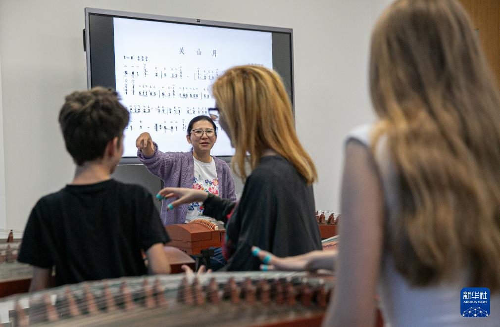 4月29日,在塞尔维亚贝尔格莱德中国文化中心,古筝指导老师王宣(后左)在教学。