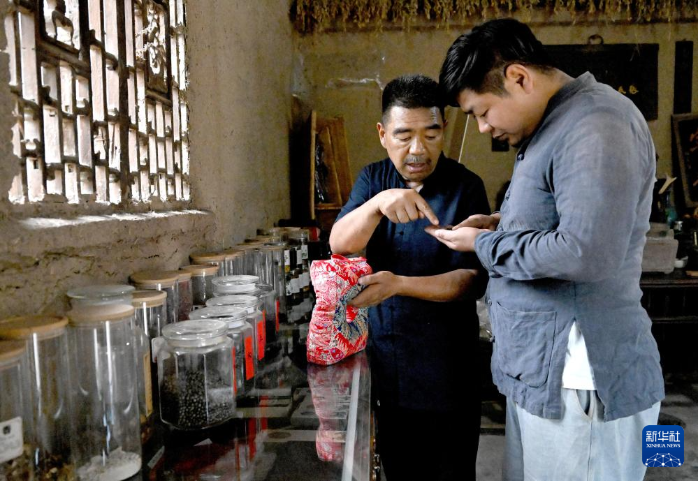 张书芳(右)在中草药种植园教儿子张力分辨中药材,讲解药材的药性(7月3日摄)。