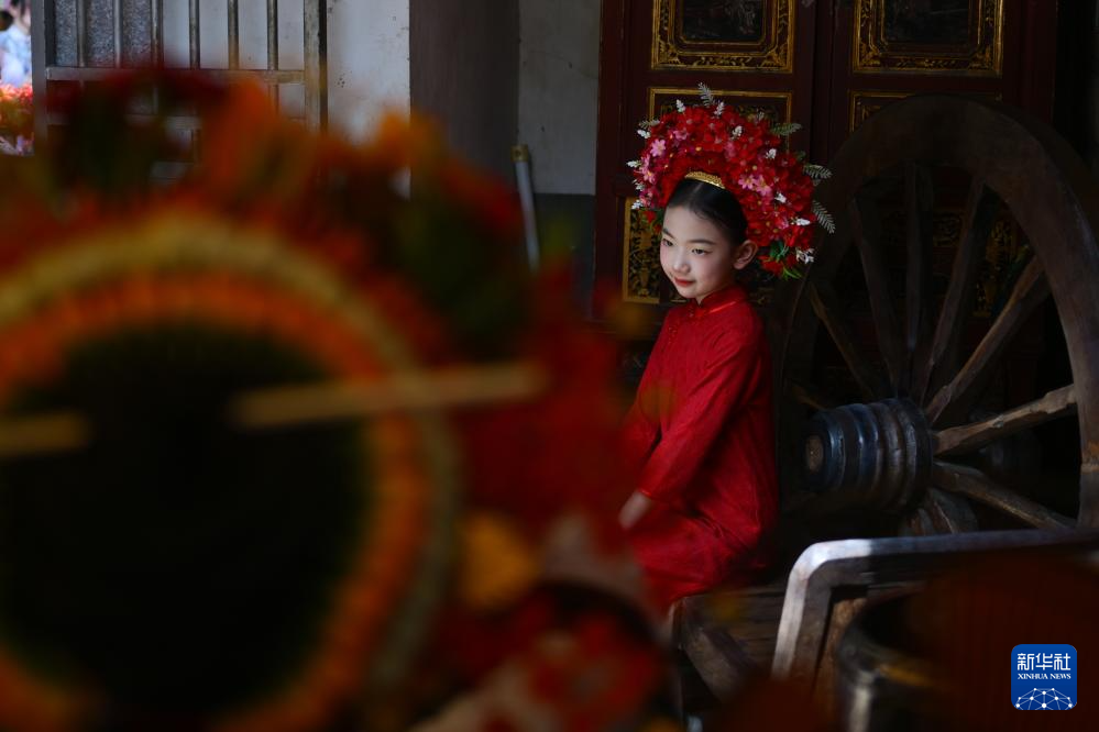 在福建泉州蟳埔村,一名小朋友戴着花围拍照(8月27日摄)。