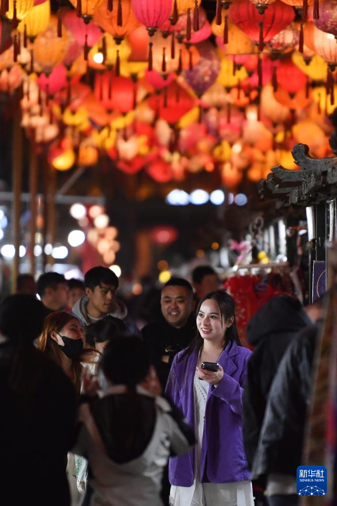 2023年3月16日,游客在敦煌夜市游览。