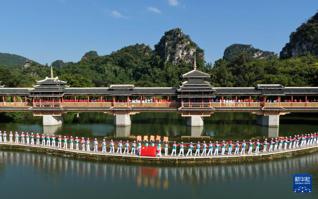 9月28日,在广西柳州市龙潭公园,人们共同唱响《我和我的祖国》(无人机照片)。