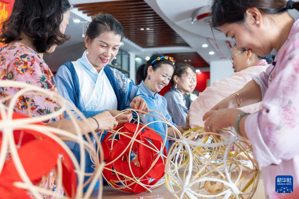 9月28日,在浙江省温岭市横峰街道马鞍桥村文化礼堂,居民们制作“滚灯”。
