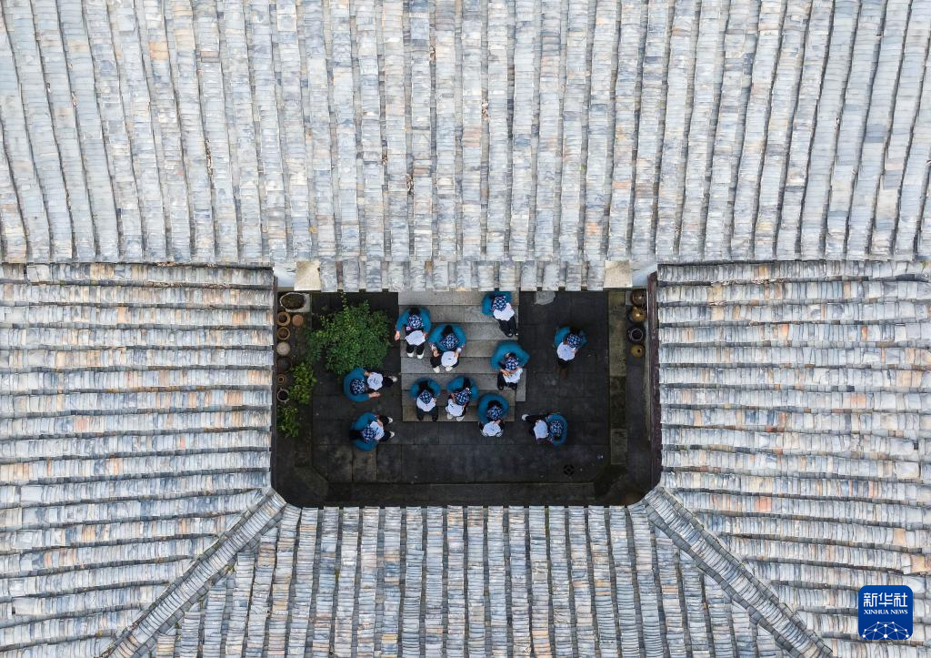 11月2日,绣娘代表在湖北省宜昌市秭归县屈原故里景区芈绣馆参加刺绣技艺比赛(无人机照片)。