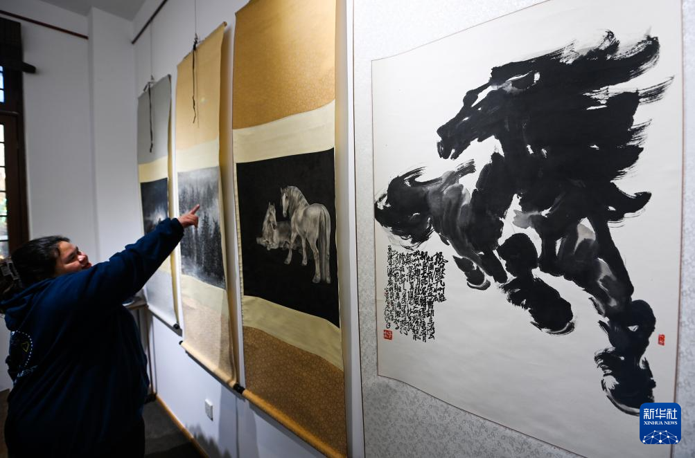 12月29日,参观者在天津古文化街参观“喜迎马年,五代画马人马画艺术展”。