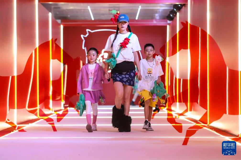 1月26日晚,在甘肃省博物馆一楼大厅,模特(中)佩戴新款马踏飞燕贺岁毛绒玩偶“红运当头马”走秀。
