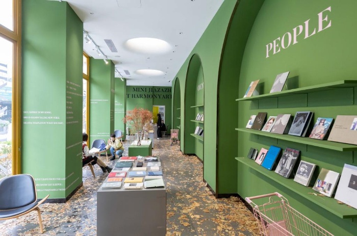 11月19日,在上海市徐汇区西岸艺术中心附近一家书店内,落叶被布置在各个角落。