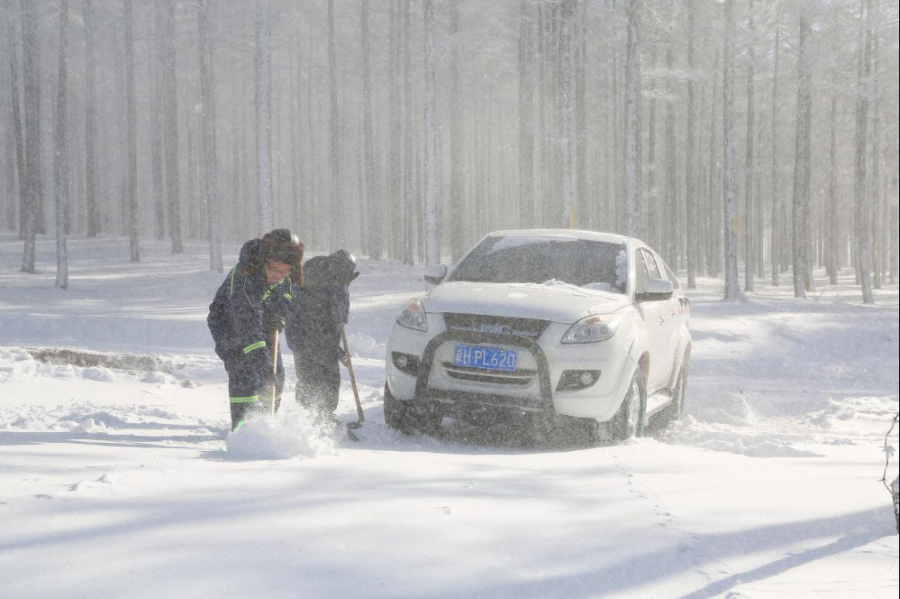 图为风场员工及时清理道路积雪