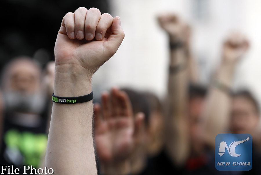 A supporter displays a wristband with the logo displaying 'No hep' during a 'Die-In' to mark World Hepatitis Day in London, July 28, 2016. (AP Photo)