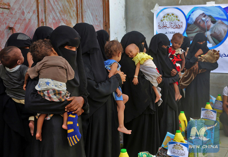 Yemeni women and children wait during food distribution in the province of Hodeida on May 30, 2018. (AFP photo)