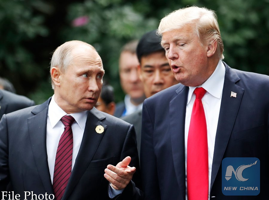 In this file photo taken on Nov. 11, 2017, U.S. President Donald Trump (R) and Russian President Vladimir Putin talk as they make their way to take the "family photo" during the Asia-Pacific Economic Cooperation (APEC) leaders' summit in the central Vietnamese city of Danang. (Xinhua/AFP)