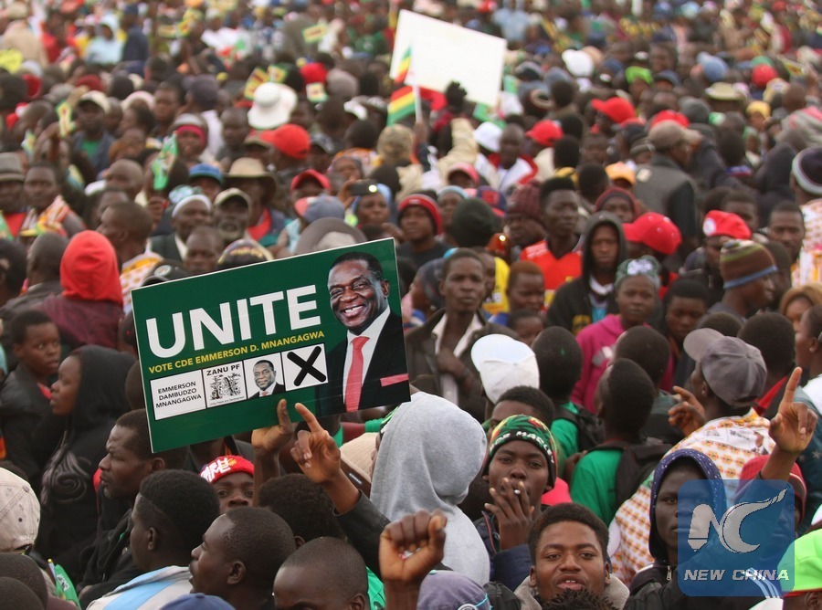 Supporters of the ruling party Zanu-PF attend a political rally at the Chipadze Stadium in Bindura, Mashonaland Central Province, Zimbabwe, July 7, 2018. Zimbabwe will hold the first post-Mugabe elections on July 30. (Xinhua/Shaun Jusa)